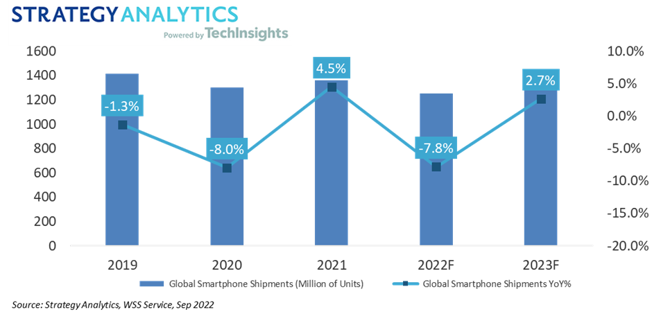鉴于俄乌抵触/地缘政治紧张局势、我国持续呈现新冠疫情,以及全球经济远景阴云笼罩,Strategy Analytics下调了2022年和2023年智能手机出货量猜测数据,较之前版别(2022年6月)有所下降。
